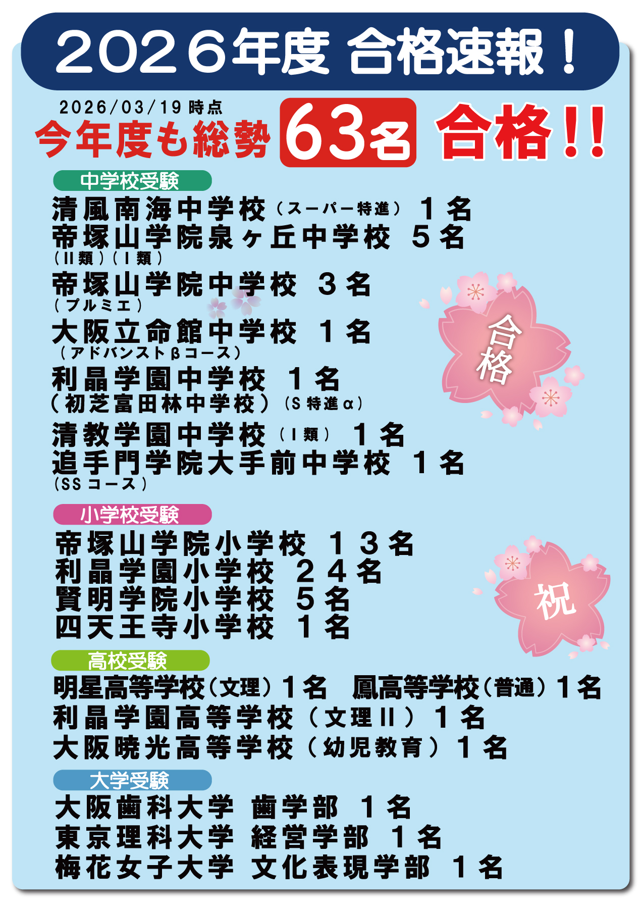 2026年度 小学校・中学校・大学受験総勢58名合格! 2026/01/21時点
