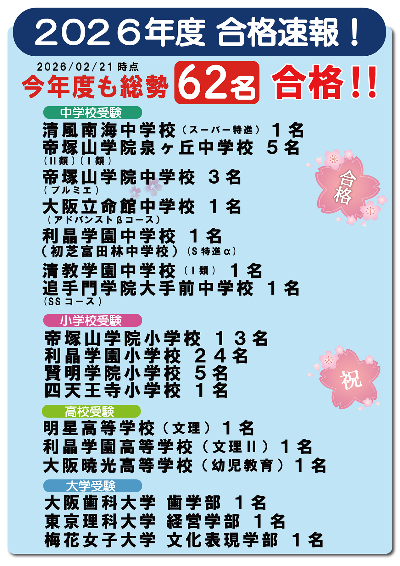 2020年度 小学校・中学校受験総勢37名合格!大阪教育大附属天王寺小学校