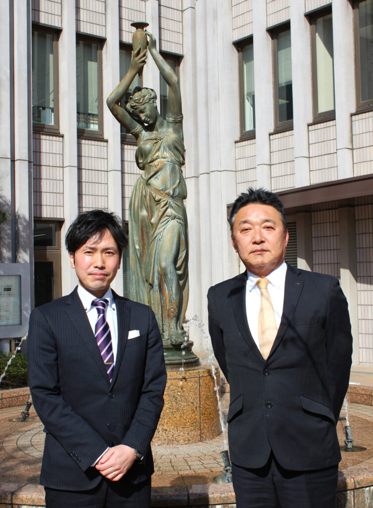 (対談の内容から、今回は卒業生などの方も懐かしい場所での写真撮影となり、うさぎとかめと噴水の前で。卒業生の方の心のふるさと。居場所です。)