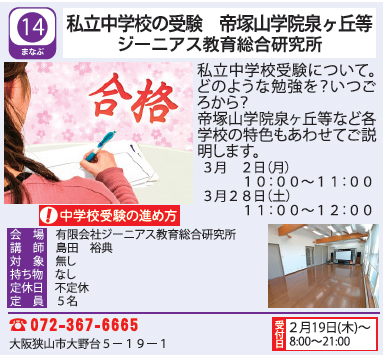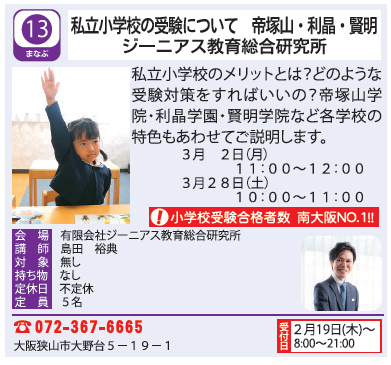 3月2日(月)と3月28日(土)の2日間、大阪狭山市商工会の『まちゼミ』にて、『私立小学校受験について(帝塚山学院小学校・利晶学園小学校、賢明学院小学校)』と『私立中学校の受験 帝塚山学院泉ヶ丘等』のお題で、講座をさせていただきます。会場は、ジーニアス教育総合研究所の多目的ホールでおこなわれます。ご予約受付は、2月19日(木)からとなります。よろしくお願いいたします。