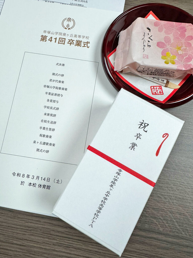 本日は、帝塚山学院泉ヶ丘中学校様の卒業式に同窓会副会長として参列させていただきました。