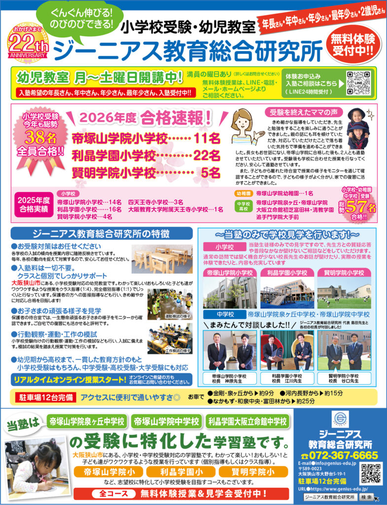 ジーニアス教育総合研究所は、帝塚山学院小学校・はつしば学園小学校・賢明学院小学校の受験に特化した幼児教室です。